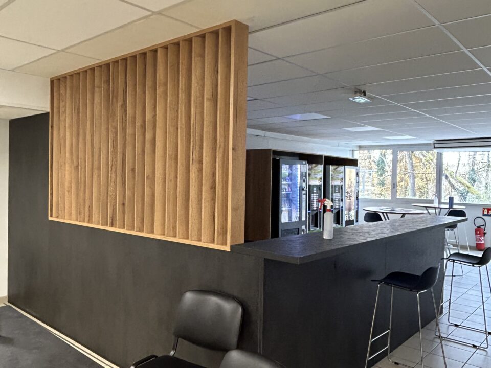 Le plan de travail et la crédence en chêne d’été s’imposent comme une évidence. Leur ton naturel s’accorde parfaitement avec le carrelage effet parquet, renforçant l’ambiance chaleureuse et accueillante de la pièce. La verrière, avec ses montants noirs, fait le lien entre esthétique industrielle et praticité : elle laisse entrer la lumière, rappelle les lignes de l’électroménager dernière génération et permet de structurer l’espace sans le fermer.