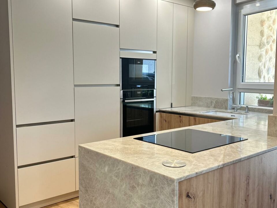 Les colonnes intégrées, les casseroliers généreux et les niches décoratives apportent un confort d’usage au quotidien, sans compromettre l’élégance du design. Cette cuisine n’est pas qu’un lieu de préparation, c’est un véritable espace de vie, pensé pour rassembler, partager et sublimer chaque instant.