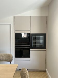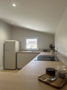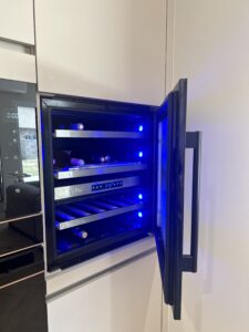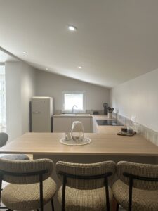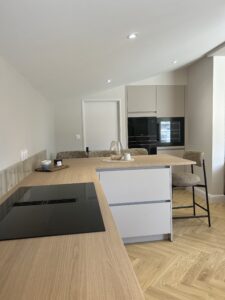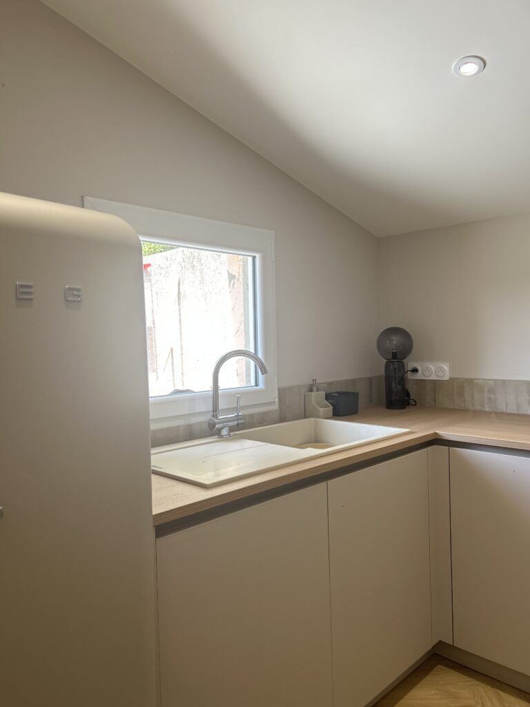Une colonne discrète abrite la cave à vin , et les finitions épurées laissent place à la lumière et à la convivialité.