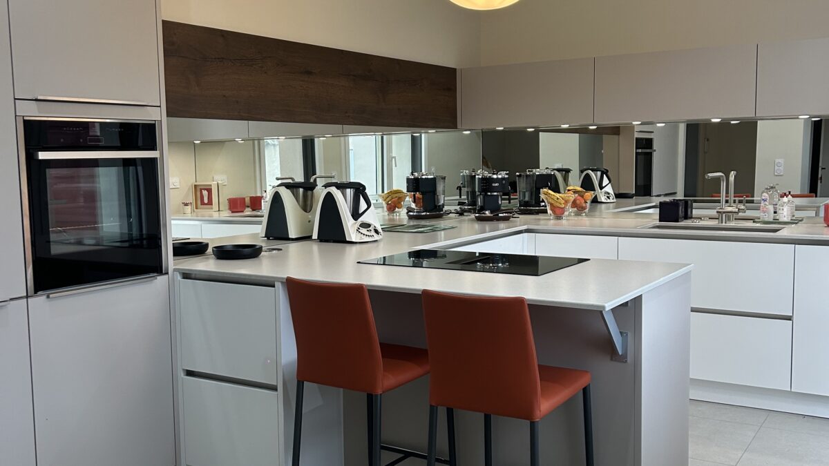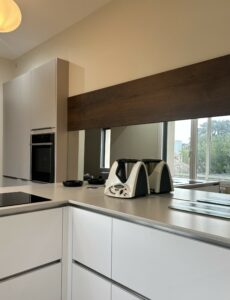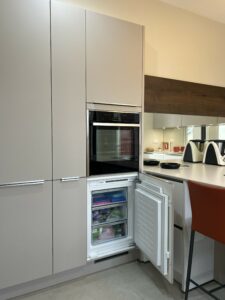 Dans ce nouveau projet, nous avons imaginé une cuisine qui ne se contente pas d’être belle : elle transforme la perception de l’espace. Lignes très épurées, façades sans poignées ainsi qu’une palette de couleurs neutres et élégantes composent l’ensemble.