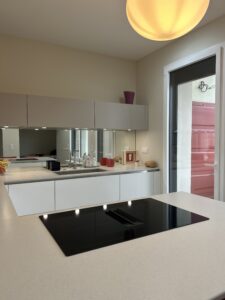 ➡️ Les crédences en miroir jouent ici un rôle clé. Elles captent la lumière, ouvrent les perspectives et créent cette sensation de profondeur qui métamorphose instantanément la pièce tout en créant un effet chic et contemporain.