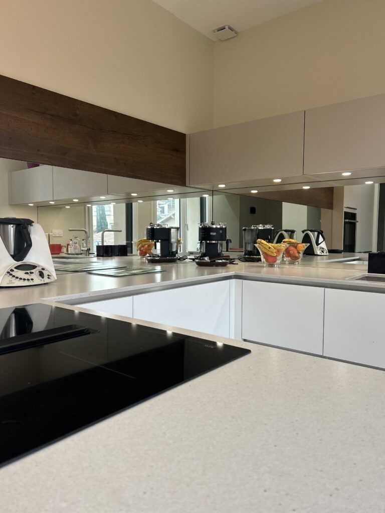 ➡️ Les crédences en miroir jouent ici un rôle clé. Elles captent la lumière, ouvrent les perspectives et créent cette sensation de profondeur qui métamorphose instantanément la pièce tout en créant un effet chic et contemporain.
