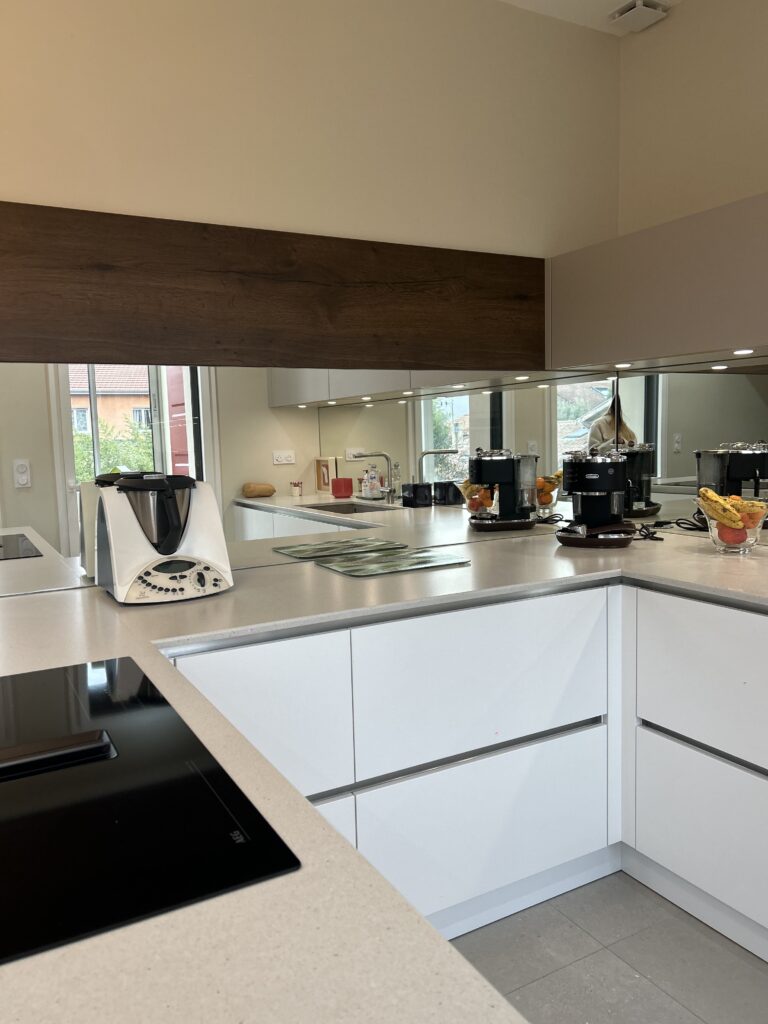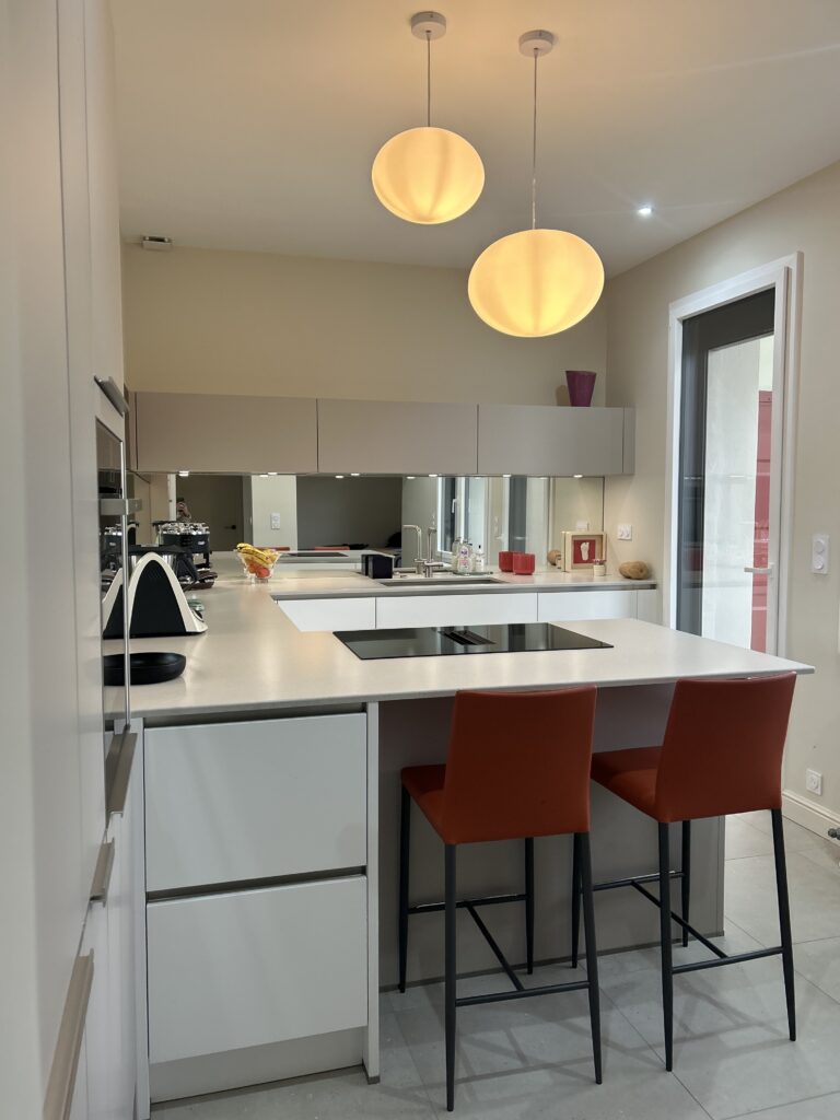 Dans ce nouveau projet, nous avons imaginé une cuisine qui ne se contente pas d’être belle : elle transforme la perception de l’espace. Lignes très épurées, façades sans poignées ainsi qu’une palette de couleurs neutres et élégantes composent l’ensemble.